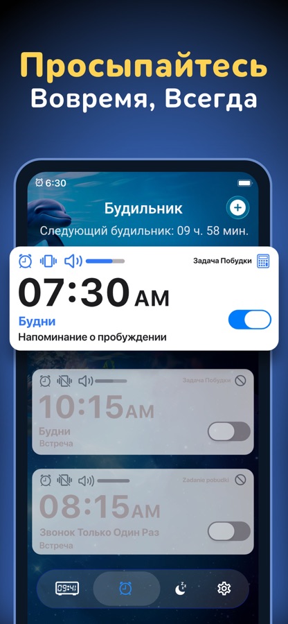 Громкий сигнал пробуждения с умными настройками будильника, обновления погоды, утренними заданиями, математическими будильниками и многим другим — всё это в одном полнофункциональном приложении-будильнике!