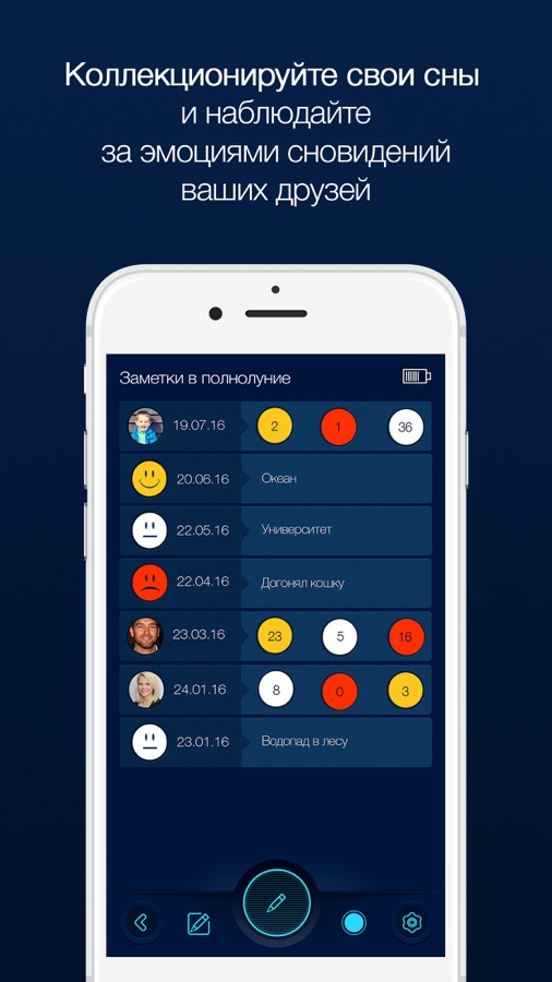Регулярно создавайте записи своих сновидений и наблюдайте за глобальной диаграммой баланса эмоциональных заметок — вносите в Мир свою историю личного настроения после пробуждения.