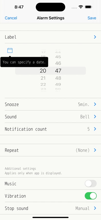 — Only when the app is displayed on the screen: Automatically stop the alarm depending on the time and number of times