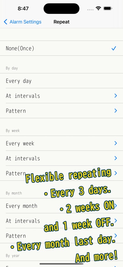 — Labeling, Date specification, Snooze, Recording of your own alarm sound, Repeat(Every week/month/year, At intervals, Pattern), Pause period setting, Number of notifications, Copy alarm