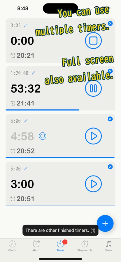 Alarms: Unlimited creation possible. Even if the screen turns off, you will be notified with a notification. Starting with iOS 26.1, it also supports AlarmKit, allowing you to hear sounds even in silent mode or focus mode.