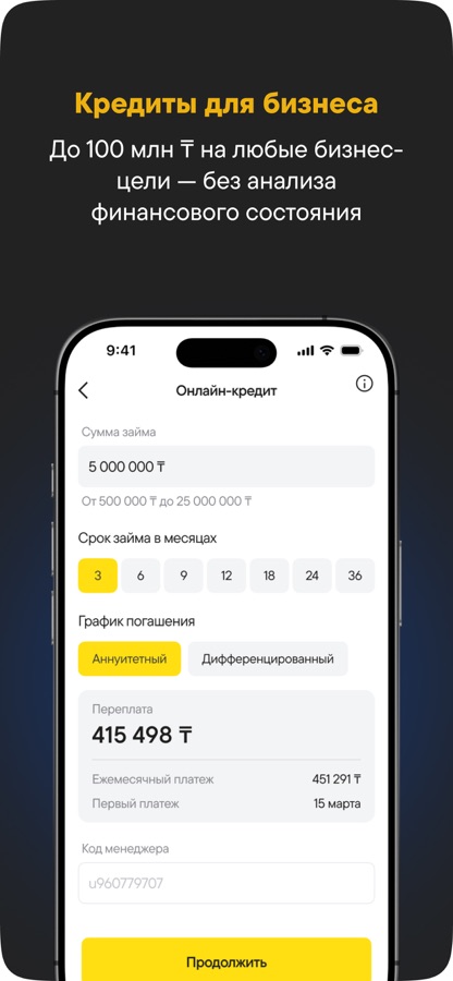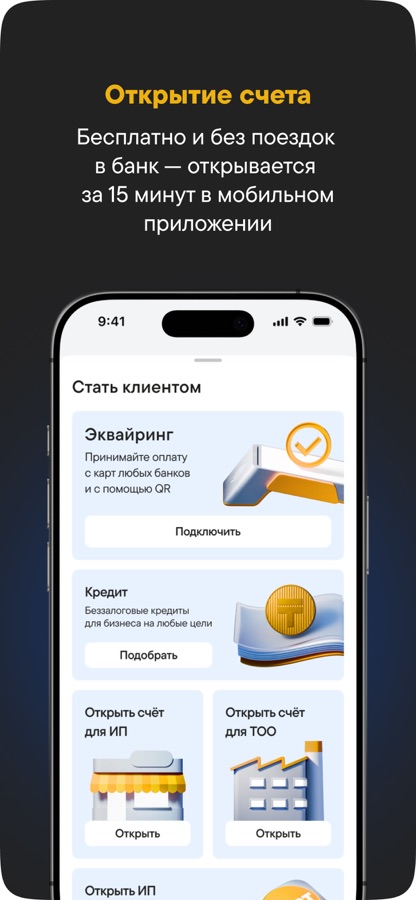 Открывайте онлайн счета в KZT, USD, EUR, RUB, KGS. Создавайте платежи и подписывайте их SMS-кодом. Сканируйте счета и отправляйте платежи контрагентам. Совершайте переводы P2P. Формируйте выписки и справки. Получайте push-уведомления по совершённым операциям.