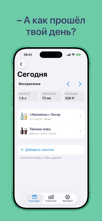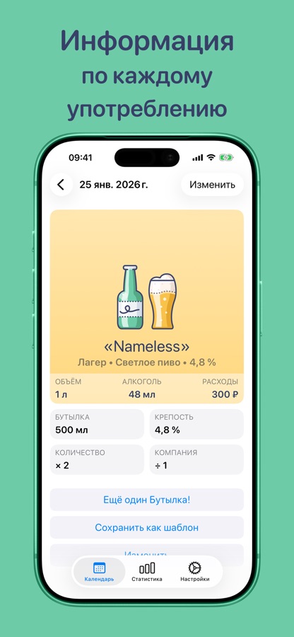 Настраивайте каждый напиток: тип, название, крепость, объём, количество и расходы.