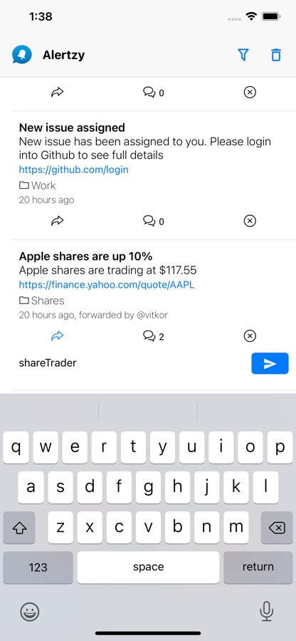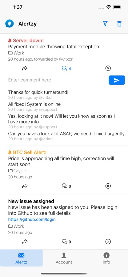 Alertzy позволяет мгновенно получать уведомления с персонально настроенной информацией с различных источников на Ваш смартфон. Приложение дает возможность систематизировать и контролировать сложные и масштабные командные проекты, распределять задачи между командами. Члены Вашей команды будут получать уведомления в режиме реального времени в виде push-notifications на личные гаджеты. При этом они могут действовать самостоятельно, переадресовать задачи более компетентному члену команды, делегировать части процесса определенным командам. Все действия команды могут просматриваться в уведомлениях в одном простом интерфейсе и позволяют пошагово контролировать прогресс выполнения задач по мере их готовности, а также своевременно вносить поправки и замечания.