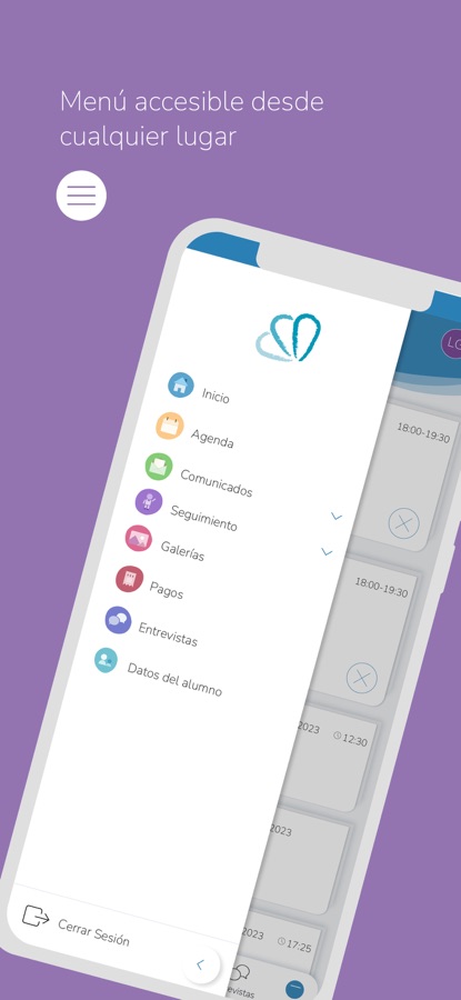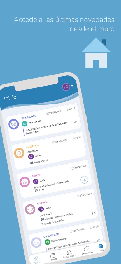 Su nueva app para familias es una herramienta muy intuitiva para la comunicación con el centro educativo, gracias a su nuevo diseño, muy visual y centrado en la usabilidad. Desde su pantalla principal tendrás acceso a toda la información publicada por el centro, y su sencillo menú te permite acceder rápidamente a la funcionalidades más utilizadas.