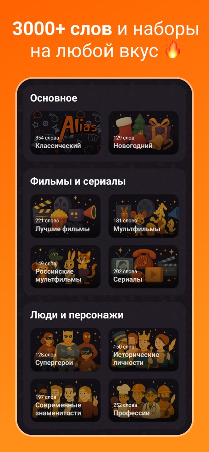 Делитесь на команды, выбирайте наборы слов и их сложность, установите порог слов для победы и время таймера, начинайте игру!