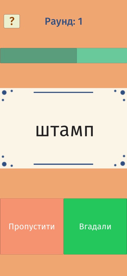 4. Вгадування і попуск супроводжується звуками, що дозволяє іншій команді знати, що натиснув гравець. В кінці кожного раунду показуються усі слова, які загадував гравець (ви можете перевірити чи правильно він нарахував собі бали і відредагувати кількість балів, якщо були помилки).