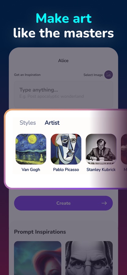 Alice transforms your prompts and art style choices into stunning digital paintings.