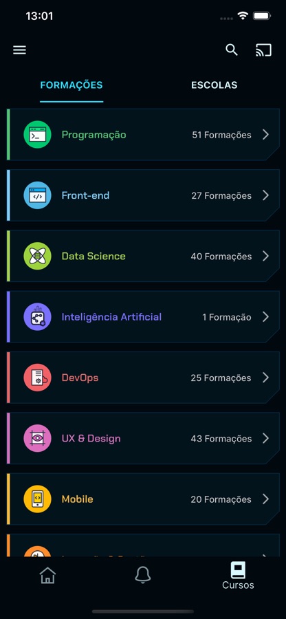 Cursos e Formações com conteúdos do mercado para você se capacitar em Programação, Front-end, Data Science, Inteligência Artificial, DevOps, UX & Design, Mobile e Inovação & Gestão.