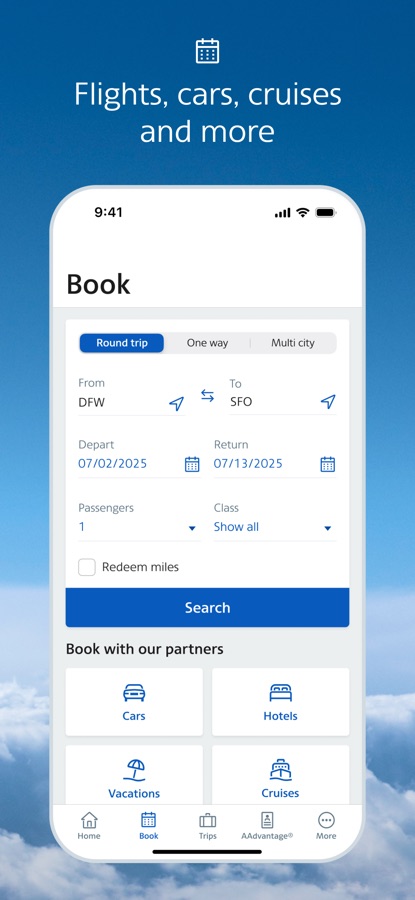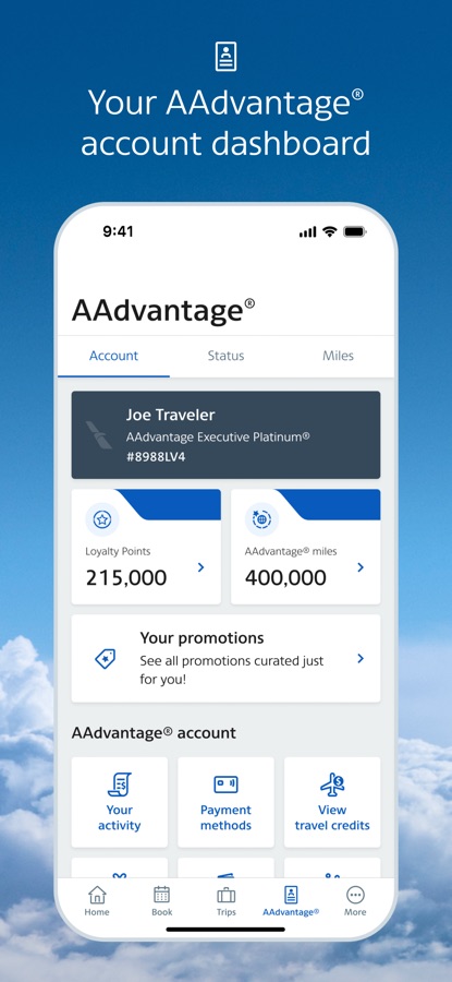 — Personalized home screen: See your next trip, AAdvantage® status, miles and Loyalty Points.