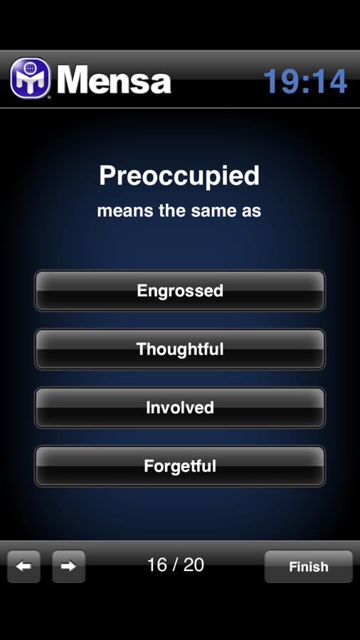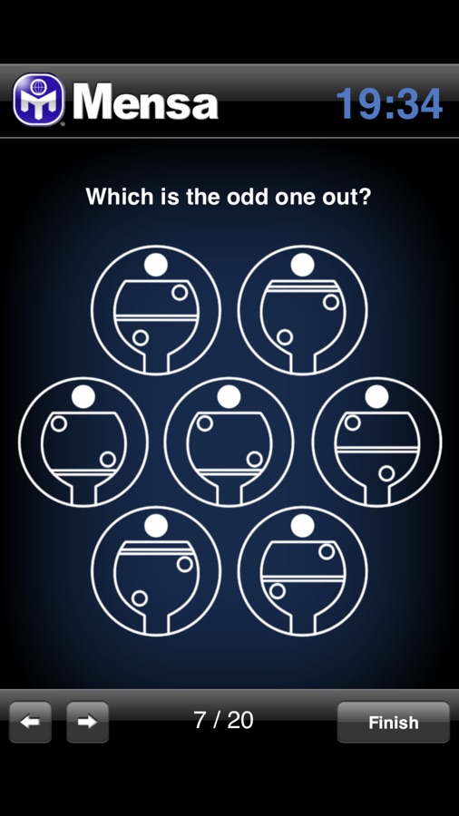 Mensa Brain Test provides genuine Mensa questions of the variety used in official Mensa test papers. Dozens and dozens of different questions ensure that every test you take is unique.