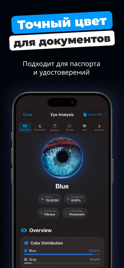 Определитель и анализатор цвета глаз — это приложение для точного определения цвета глаз и анализа радужной оболочки с использованием технологий ИИ. Может быть полезно для личных целей, подготовки документов или простого любопытства.