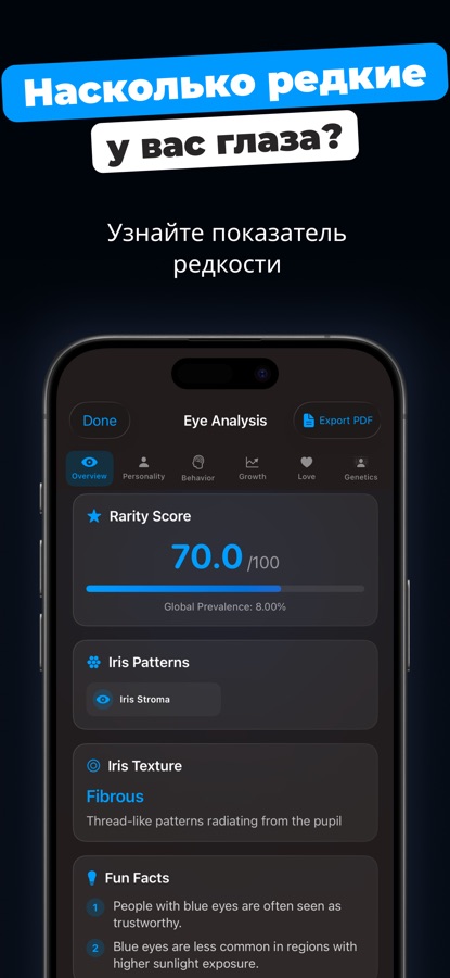 Алгоритм анализирует фото и показывает точный оттенок радужки.