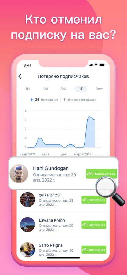 — Просмотрите потерянных/приобретенных подписчиков за 1 неделю/месяц/год…
