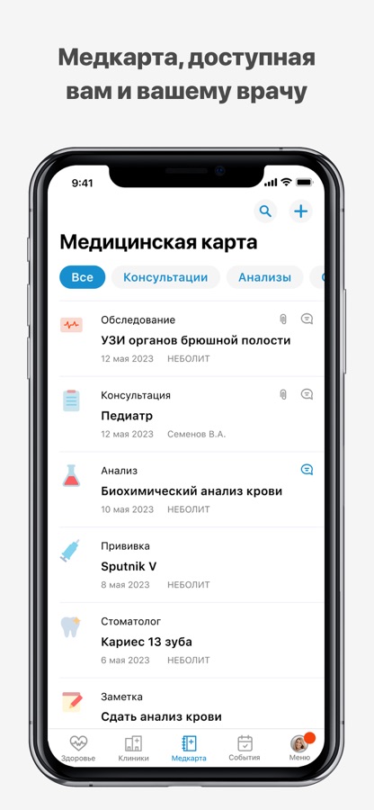 • Напоминания в формате push-уведомлений о запланированных визитах и приеме лекарств