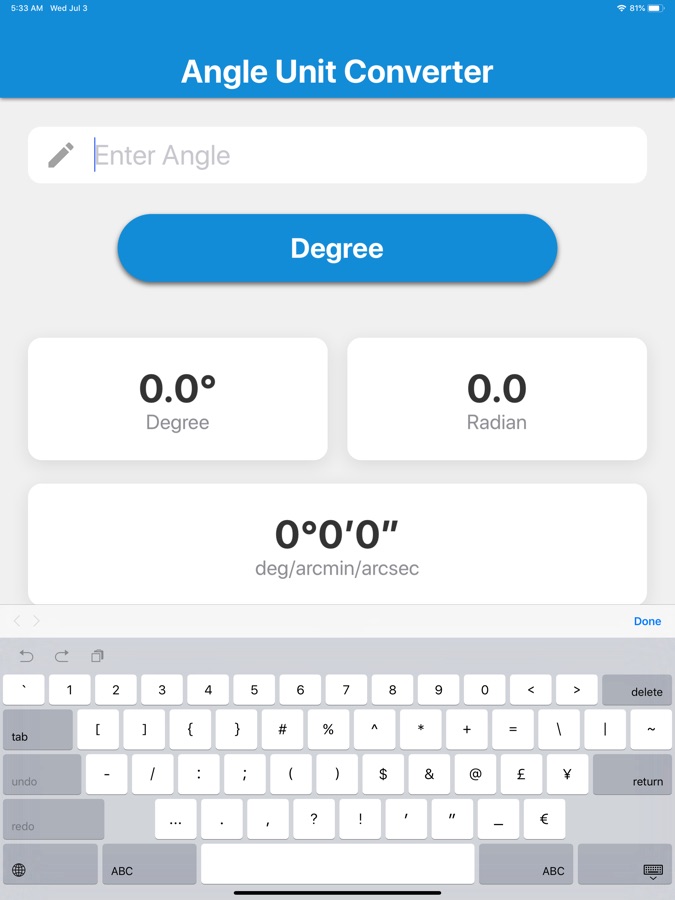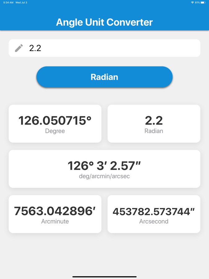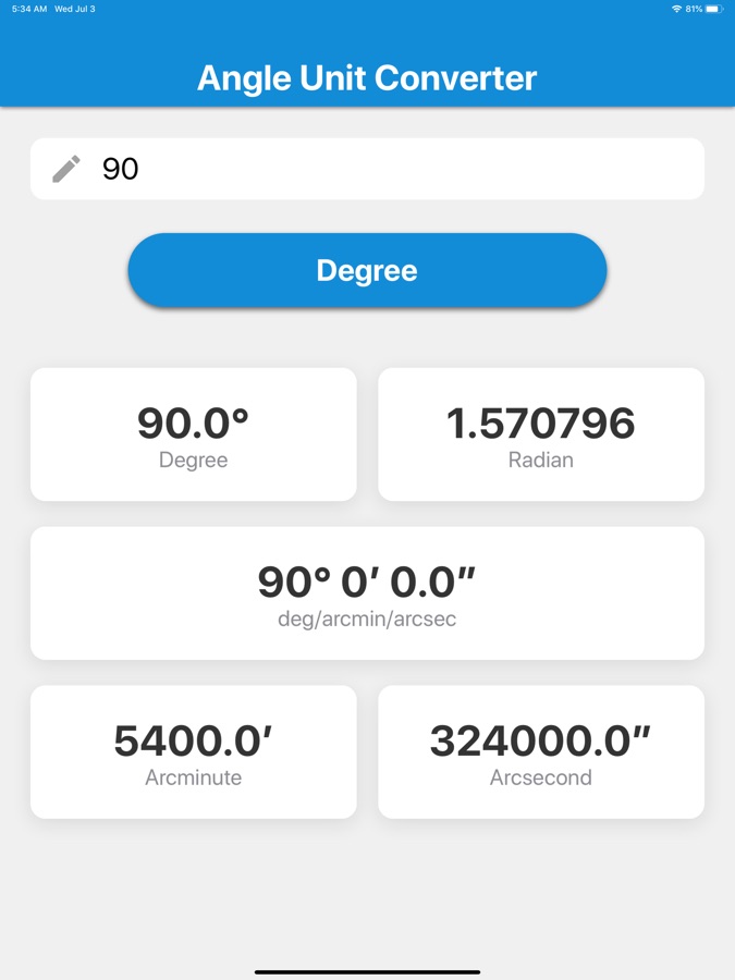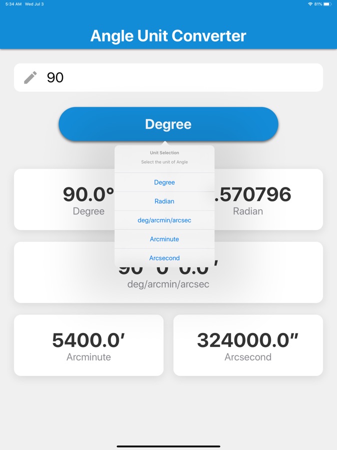 Just enter the value of the angle, then tap the blue unit selection button to select the unit of the angle, and the values converted to 5 types of units will be displayed.