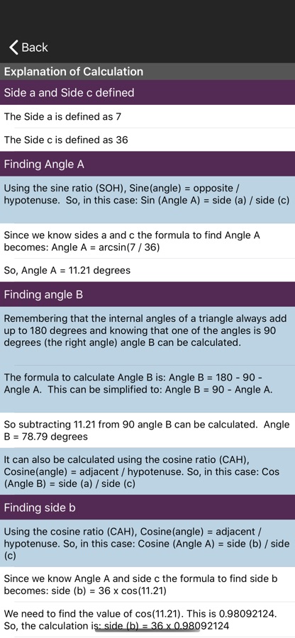 The App is simple to use. Just enter an angle and a side or two sides and all the others will be calculated for you. To see how the answers were arrived at just select the ‘Workings’ button and a page is shown with a comprehensive set of steps to show how each was calculated.