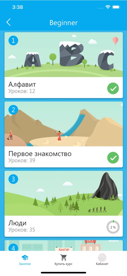 Курс — это последовательность тем и уроков. Каждый урок включает в себя видеообъяснение темы, за которым следует набор простых тренировок для закрепления усвоенного материала.