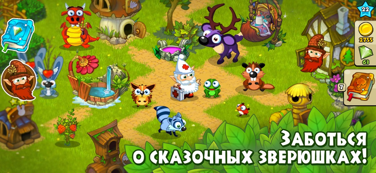 Познакомься с весёлыми обитателями Деревни Волшебного Леса – строй для лесных зверюшек уютные домики, корми и играй с ними, открывай и приручай новые виды птиц и животных!