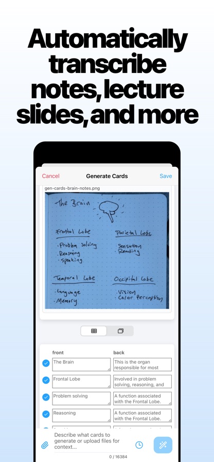 • Prompt AI to make flashcards for you based on text and pictures. Turns handwritten notes and diagrams into flash cards for you.
