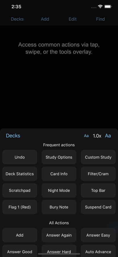 — A flexible interface designed for smooth and efficient study. You can set up AnkiMobile to perform different actions when you tap or swipe on various parts of the screen, and control which actions appear on the tool buttons.