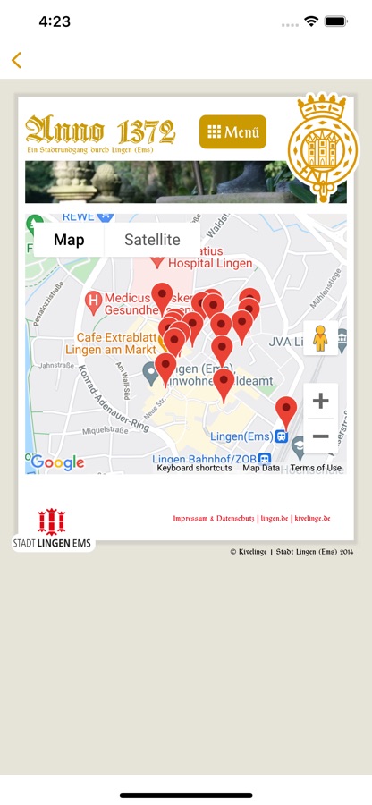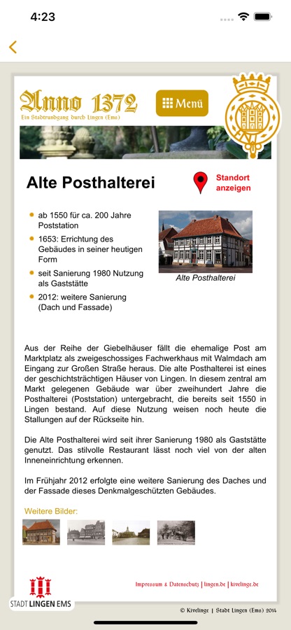 «Anno 1372“ ist ein Rundgang durch Lingen (Ems) bei dem Sie die Stadtgeschichte unserer schönen Heimat spüren können. Vom Kivelingshaus über das Historische Rathaus bis zum Professorenplatz möchte Sie „Anno 1372“ mit auf eine Zeitreise nehmen und die Geschichte einzelner Stationen erlebbar machen.