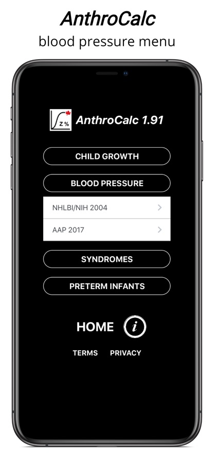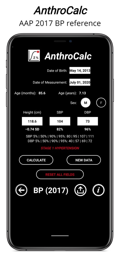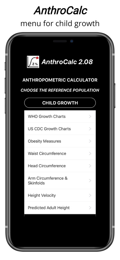 The AnthroCalc app calculates percentiles and Z-scores for length/height, weight, weight-for-length/height, body-mass index, and head circumference for typically growing children (using WHO or CDC references); for children with a number of syndromes (Turner, Down, Prader–Willi, Russell–Silver, Noonan and Klinefelter); and for preterm infants (using Fenton 2013 and 2025, INTERGROWTH-21st, or Olsen references). The app also performs specialized calculations of blood pressure (using NIH 2004 or AAP 2017 references), extended obesity measures, waist circumference, arm circumference, triceps and subscapular skinfolds, target (midparental) height, predicted adult height, and height velocity for healthy children. Citations are provided for each reference range used for the calculations.