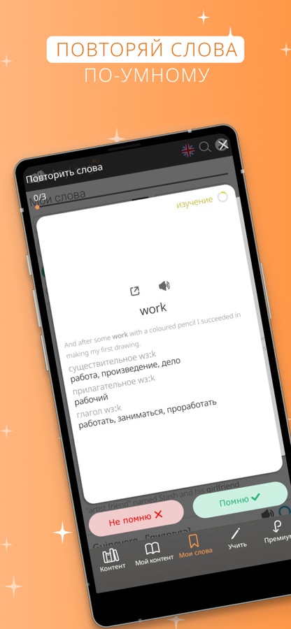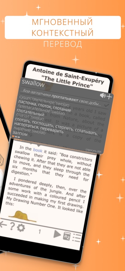 Основная фишка – мгновенный перевод слов прямо в тексте, что значительно экономит время. Сочетание словарных статей и контекстного перевода позволяет быстро получить полное представление о значении слова. В отличие от книг, адаптированных по методу Ильи Франка, перевод на русский не мелькает перед глазами, а появляется только по нажатию на соответствующий фрагмент текста. Незнакомые слова можно добавлять в свой словарь и повторять в удобном для себя режиме.