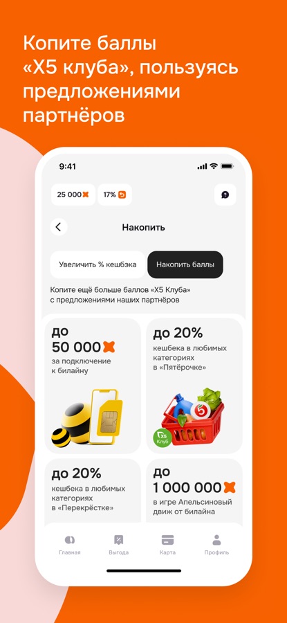 Пользуйтесь предложениями партнёров и увеличивайте свой кешбэк в «Пятёрочке» и «Перекрёстке». Копите баллы «X5 Клуба» за покупку продуктов и оплату услуг.