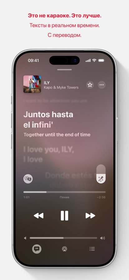 • Функция «Пение» в Apple Music уменьшает громкость вокала, чтобы Вы могли подпевать своим любимым песням. Теперь можно объединить iPhone и Apple TV в пару, чтобы использовать iPhone как микрофон. Это не караоке — это еще лучше!