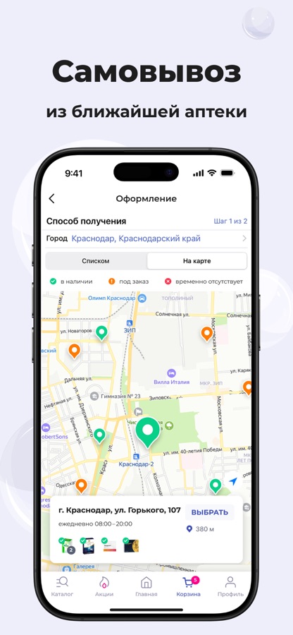 Вы находите необходимый товар в поиске или каталоге, добавляете его в корзину, далее определяете аптеку для самовывоза или адрес для доставки и подтверждаете заказ. Как только заказ будет сформирован и готов к выдаче, на указанный вами номер телефона вы получите смс-сообщение или уведомление в приложении о том, что заказ готов к выдаче.