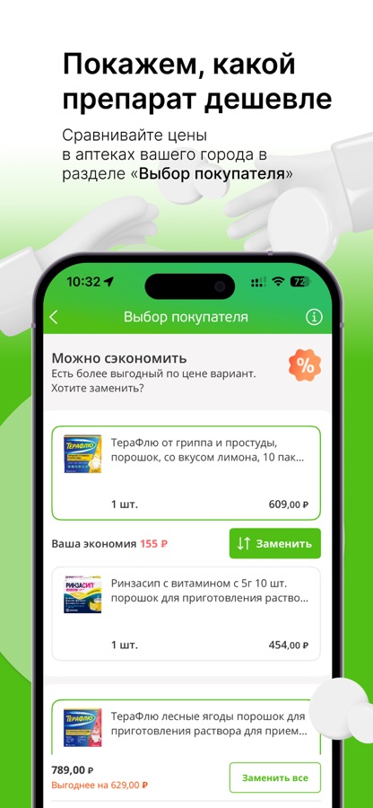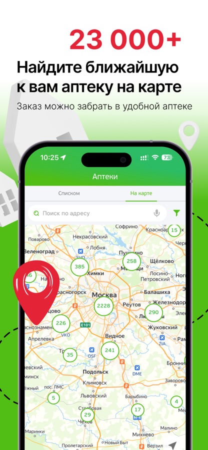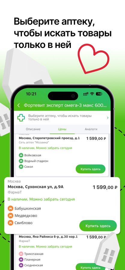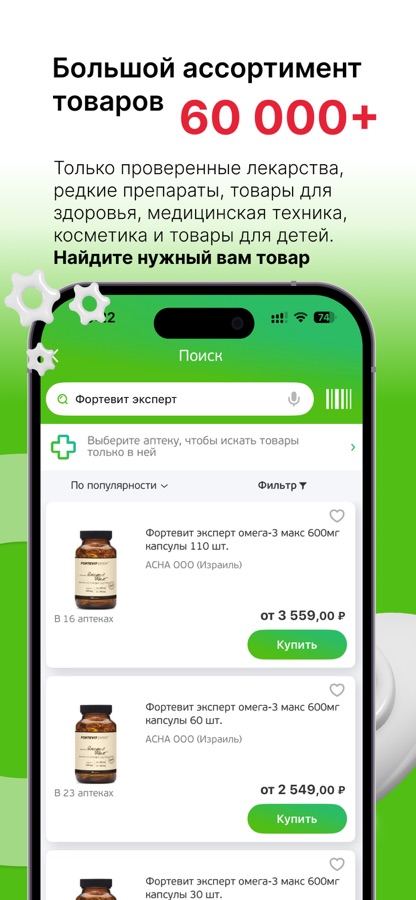 Введите название препарата, активное вещество или отсканируйте штрихкод ー приложение выдаст вам нужные товары во множестве аптечных сетей по всей стране. Добавляйте аптеки и препараты в избранное, чтобы заказывать еще быстрее.