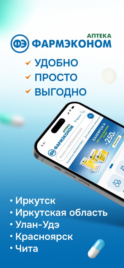 Закажите лекарства с доставкой в аптеку — быстро и выгодно. Приложение интернет-аптеки ФАРМЭКОНОМ объединяет более 250 аптек в таких городах и населенных пунктах, как: Красноярск, Иркутск, Улан-Удэ, Чита, Братск, Ангарск, Черемхово, Усолье-Сибирское, Шелехов, Белореченский, Мегет, Михайловка, Хомутово, Зима, Саянск, Свирск.