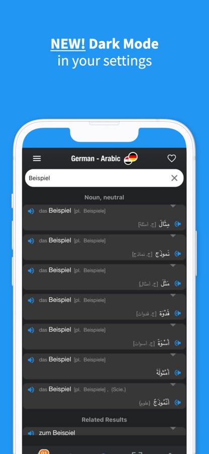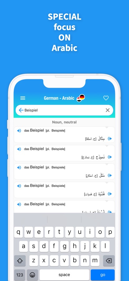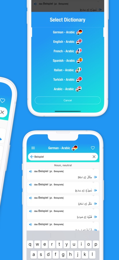 The app provides translations for Arabic, German, English, French, Italian, Spanish,Portuguese, Dutch, Polish, Hungarian, Danish, Ukrainian, Kurdish, Finnish, Greek, Czech, Farsi, Swedish and Turkish.