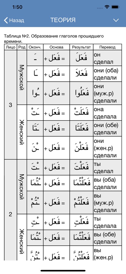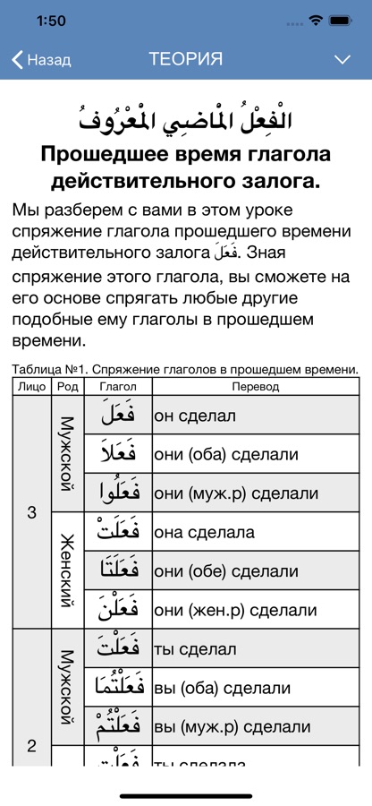 Занимаясь по этому приложению, вы поймете как образуются и спрягаются арабские глаголы и прочно запомните их спряжение.
