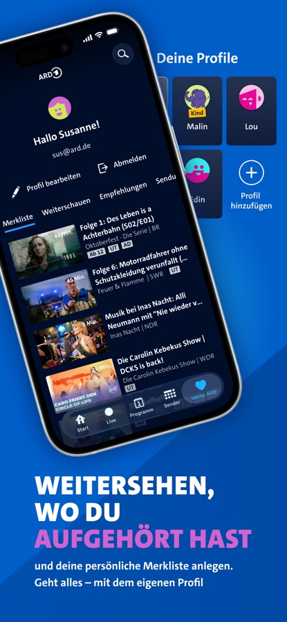 Mit deinem eigenen Profil in der ARD Mediathek streamst du noch komfortabler. Schau Videos da weiter, wo du sie beim letzten Mal pausiert hast.