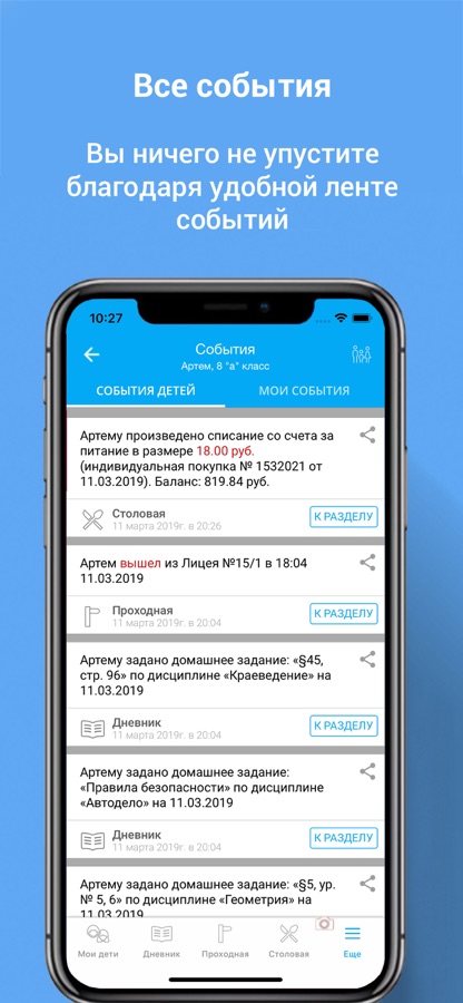 «Проходная» — у родителей будет возможность отслеживать проходы ребенка через «Электронную проходную» (система контроля доступа в учебном заведении) и получать push-уведомление о каждом входе/выходе ребенка из учебного заведения.