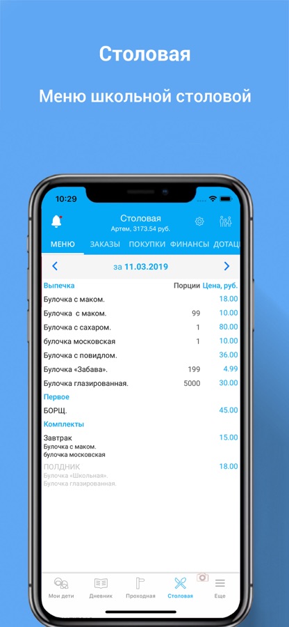 «Столовая» — родители и дети смогут просматривать информацию о школьной столовой и школьном буфете: меню, что приобретал ребенок, контролировать остаток средств на карте ребенка, просматривать информацию о начислениях дотаций.