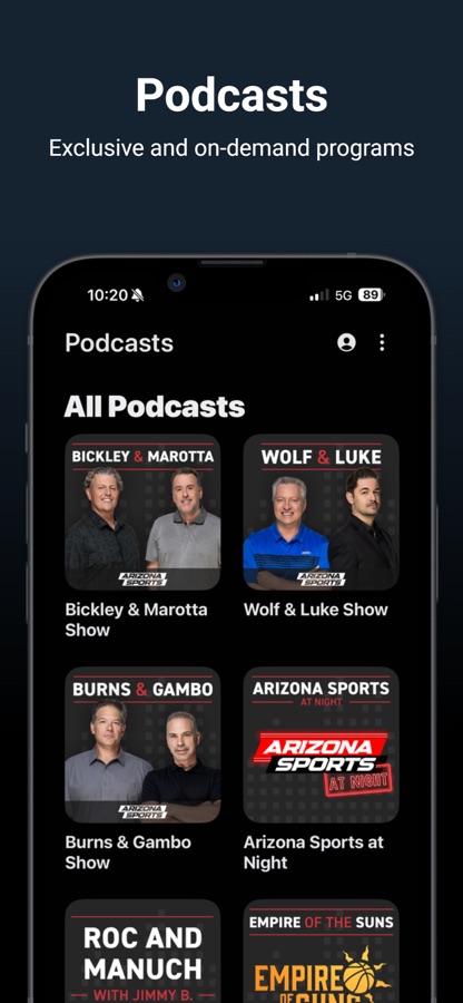 Never miss an Arizona Sports show with podcasts from all your favorite hosts: Bickley & Marotta 6-10 a.m., Wolf & Luke 10 a.m. to 2 p.m. and Burns & Gambo 2-6 p.m. Pick up where you left off and share highlights and episodes with your friends.