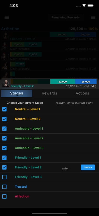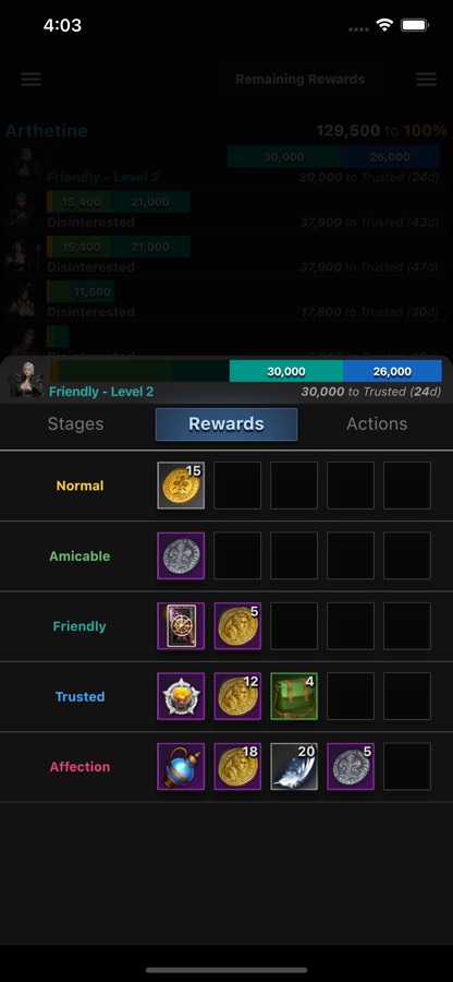 — Shows all Rapports along with stage levels and rewards, you can choose stage achieved, and even input the current point to see how many points you still need to reach the «Trusted Stage»