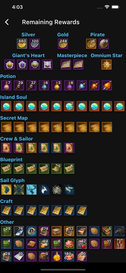 — List all rewards based on the stage you have received, and classify the rewards by type (For example gold, island, Giant’s Heart…)