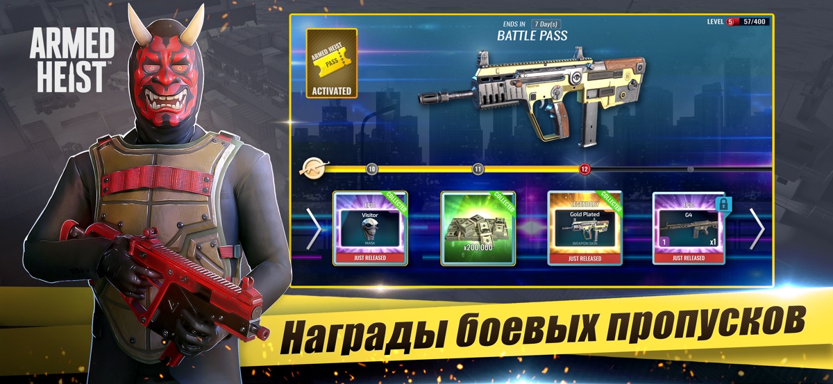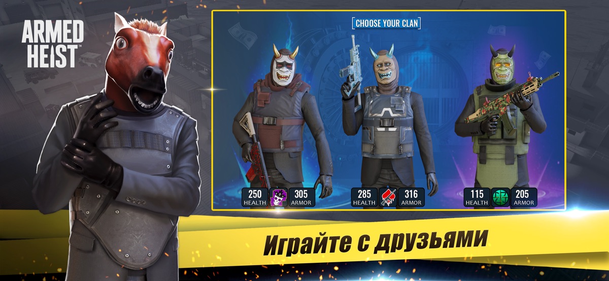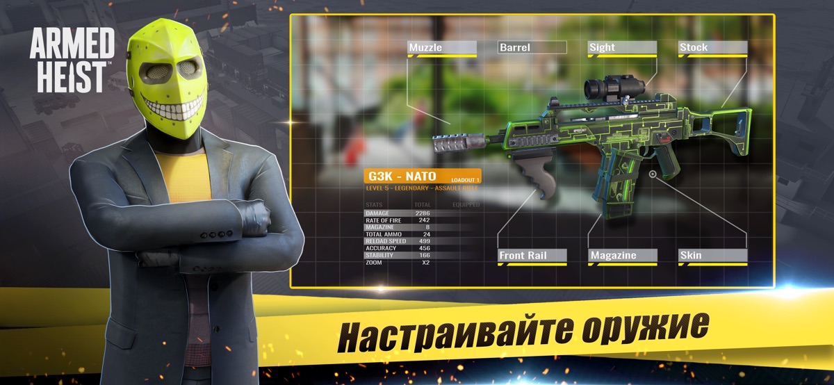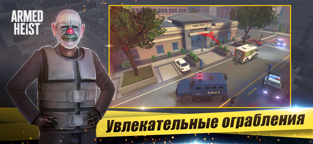 • Усиливайте своего персонажа — создайте своего уникального безжалостного грабителя! Хотите внешность клоуна-убийцы? Спецназовца? Отпетого гангстера? Собирайте маски, бронежилеты и невероятные костюмы. В этом шутере о третьего лица вас ждет детализированная 3D-графика и увлекательный геймплей с множеством перестрелок!
