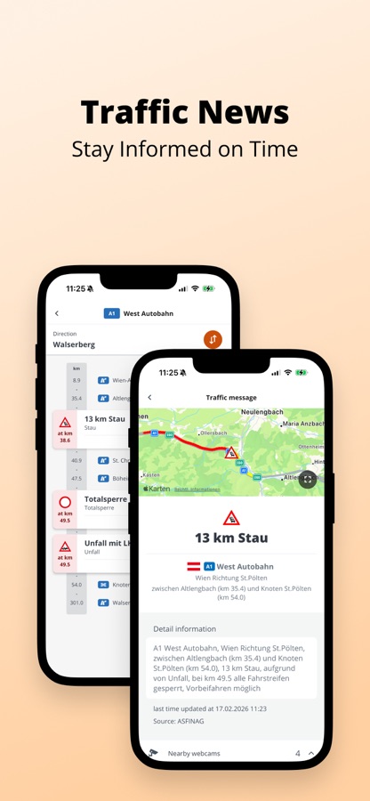 Webcams — Access to over 2000 live webcam images along with the motorway network including the webcams of the neighbouring countries Italy (Brenner), Croatia, Slovenia, and Hungary.