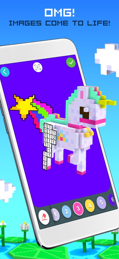 Все, что вам нужно сделать – это раскрасить картинку по номерам, и вы получите шедевр пиксельной объемной графики. Поворачивайте ваше творение на 360 градусов. Смотрите, как оживает рисунок благодаря классной анимации.