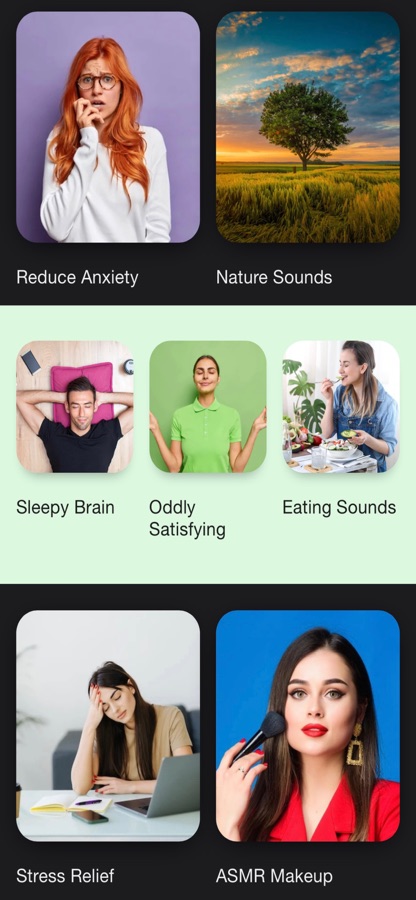В приложении ASMR звуки и видео для сна есть несколько удивительно приятных видео и расслабляющая музыка, чтобы расслабить ум. Наслаждайтесь резкой ASMR, нарезкой ASMR, расслабляющими звуками, едой ASMR, приятной нарезкой мыла, звуками еды ASMR и звуками шепота в приложении для снятия стресса для сна. Найдите свои любимые видео и звуки ASMR и выберите одну из нескольких тем. Просмотр таких АСМР-видео или прослушивание АСМР-звуков может помочь снять стресс и используется для ухода за собой и внимательности.