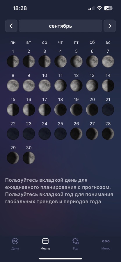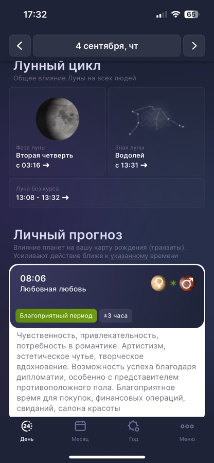 + в приложении есть лунный календарь на каждый день с рекомендациями (фаза Луны, знак Луны, Луна без курса, ретроградные планеты)