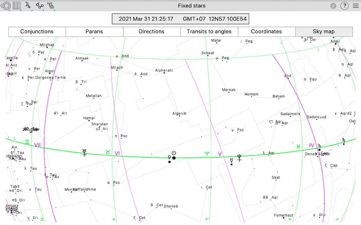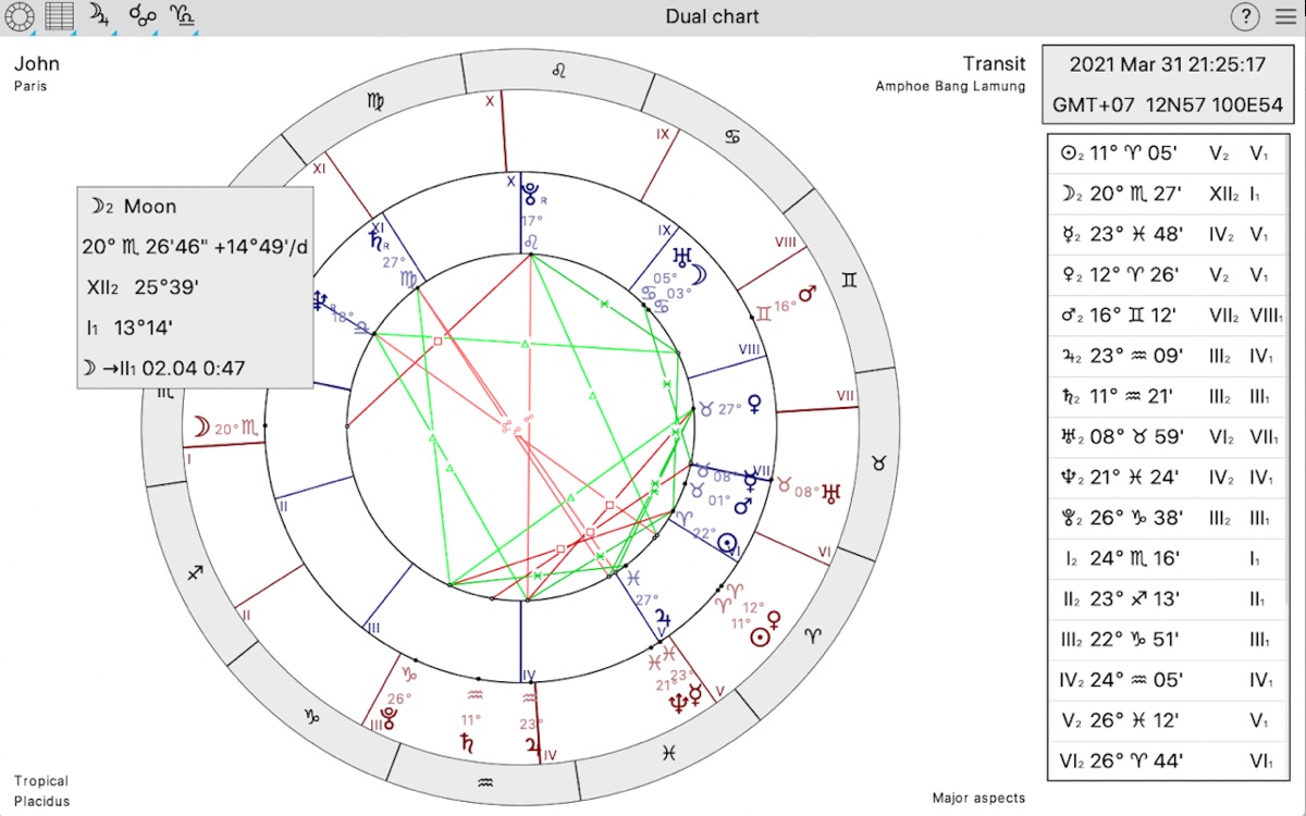 — Ингрессии планет, экзакты аспектов в транзитной карте — коснитесь значка планеты или линии аспекта;