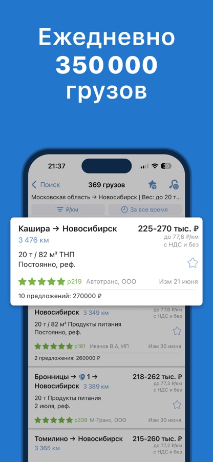 ATI.SU — это удобное приложение для грузовладельцев и перевозчиков. Здесь вы найдете всё, что нужно для эффективной логистики: подходящие грузы, проверенных перевозчиков и удобные инструменты для работы.