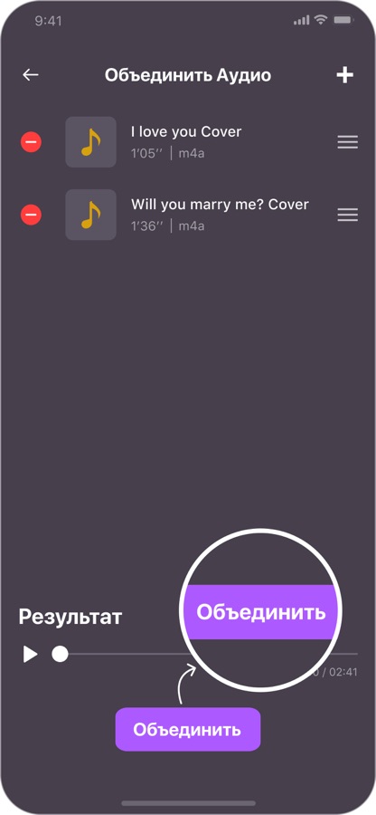 • Объединяйте несколько аудиофайлов, даже если они не в одном формате.