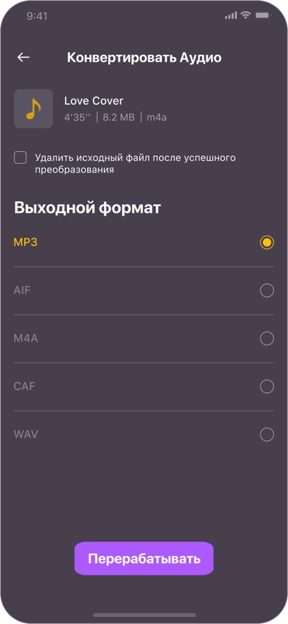 • Быстро конвертируйте формат аудио без потери качества: mp3, aif, m4a, caf, wav.